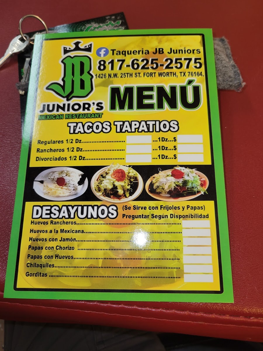 Welcome to J.B Junior Taqueria, a charming little spot tucked away at 1426 NW 25th St, Fort Worth, TX. This taqueria, although small, packs a flavorful punch in every bite. Renowned for its authentic offerings, the menu features highlights such as tapatíos, menudo, and barbacoa, each dish echoing the rich culinary heritage of Mexico.
